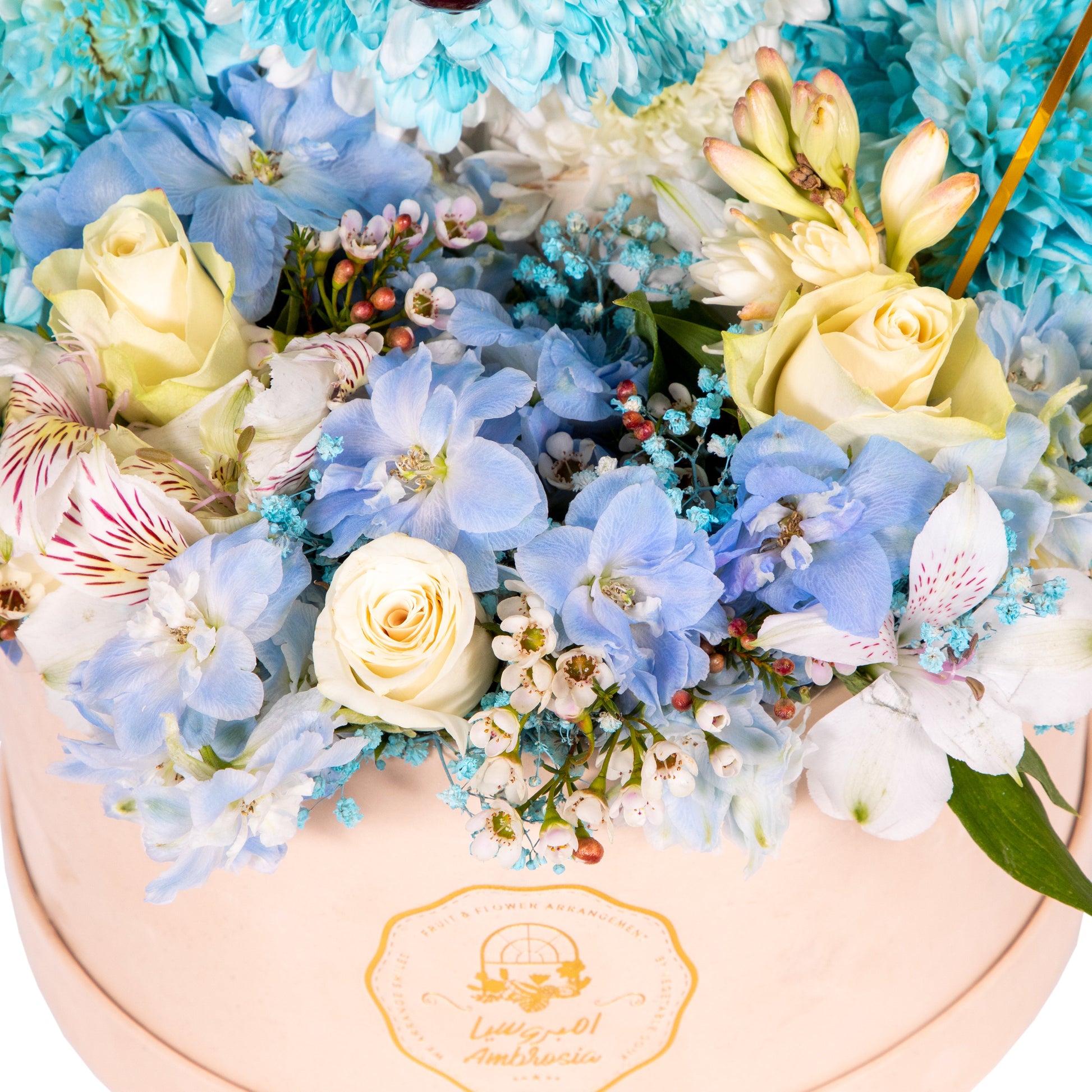 Ambrosia Beary Blue Gift Box is the perfect gift to express your love with flowers and teddy bears for your loved ones. Do you want to give them a diverse gift of blue flowers and cute teddy bears on Valentine's Day, Mother's Day, or any special occasion? Look no further, just choose Ambrosia Beary Blue Gift Box from The Fresh Market and make their day happier and sweeter. This blue display of flowers and teddy bears is a presentation of fresh and charming flowers and teddy bears, carefully crafted from the finest ingredients imported from The Fresh Market. Ambrosia Beary Blue Gift Box is a unique blue display of flowers and teddy bears, made from a mix of selected flowers and teddy bears, adorned with the finest imported and local flowers and teddy bears, including wax flower (white and pink), mixed chrysanthemums, spray roses in Snowflake White, Delphinium, and Proud White roses. It is a wonderful and enchanting gift of flowers and teddy bears.