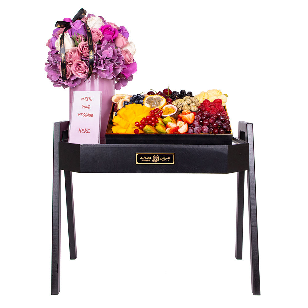 Ambrosia Fresh and Wild Fruit Platter is the best gift to express your fresh and wild love for your loved ones. Do you want to give them a diverse gift of fresh and wild fruits and flowers on Valentine's Day, Mother's Day, or any special occasion? Look no further, just choose Ambrosia Fresh and Wild Fruit Platter from The Fresh Market and make their day happier and sweeter. This fresh and wild plate of fruits and flowers is a display of fresh and appetizing fruits and flowers, carefully crafted from the finest ingredients imported from The Fresh Market. Ambrosia Fresh and Wild Fruit Platter is a unique plate of fresh and wild fruits and flowers, made from a mix of selected fruits and flowers, adorned with the finest imported and local fruits and flowers, including organic figs from the UAE, blackberries from Portugal, strawberries from South Africa, red Candy Snap grapes from the United States, Granadilla from Colombia, prickly pear from Colombia, cherries from the United States, spray roses in Juliet, and O'Hara roses. It is a delightful and healthy plate of fresh and wild fruits and flowers.
