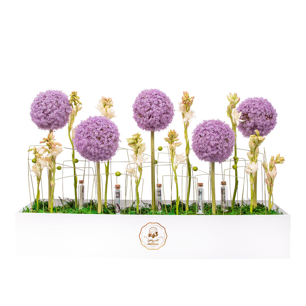 - The Fresh Market: Ambrosia Purple Sensation Flower Arrangement comes from The Fresh Market, renowned for offering luxurious gifts and creative designs, reflecting its commitment to quality and elegance.
