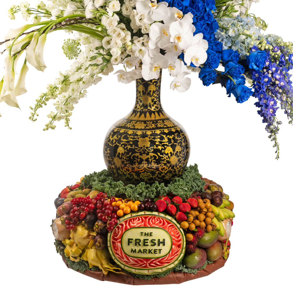 The Fresh Market presents to you a new masterpiece that combines the beauty of flowers and the delight of fruits, Ambrosia Queen Blue Royal Gourmet Floral Arrangement. It is a meticulously crafted artistic masterpiece, presented in a large pink vase adorned with splendid colors, and a base of fresh fruits to complement its beauty.