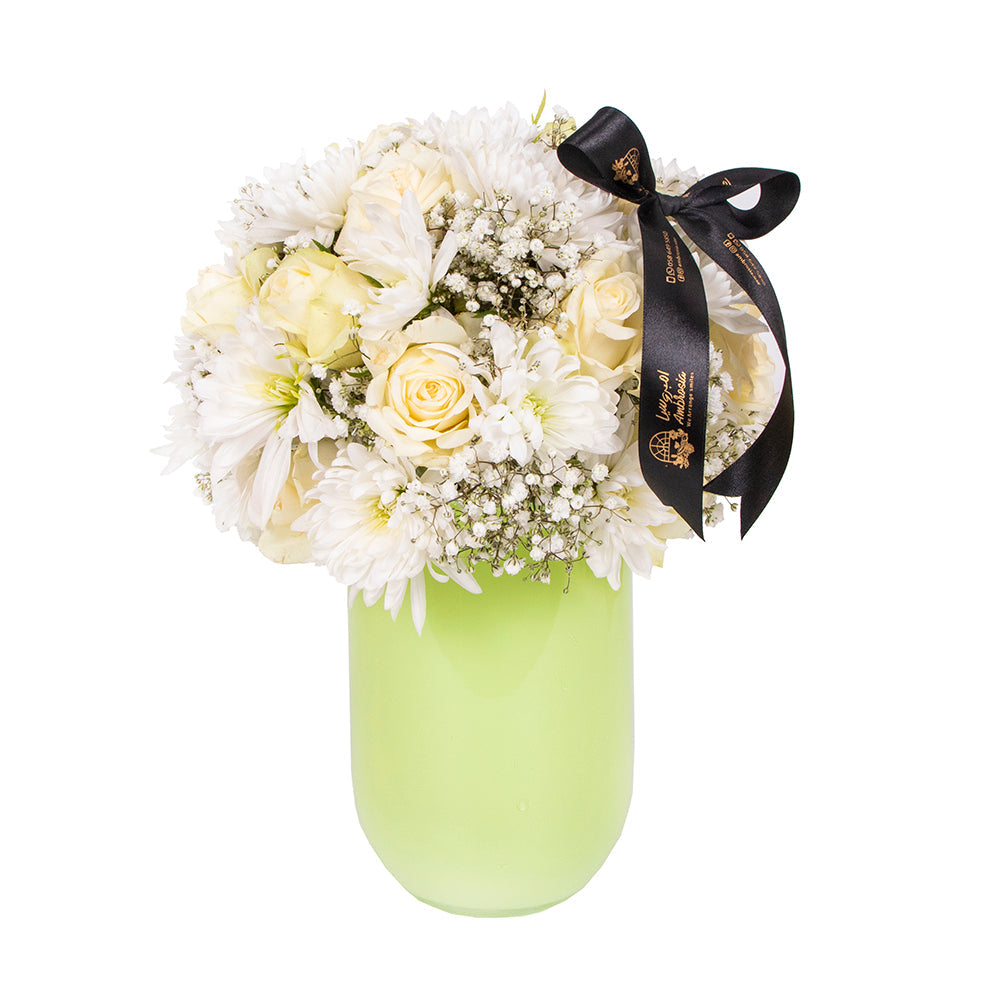 Ambrosia White Paradise Eid Special Flower Arrangements, a creation exuding purity from The Fresh Market, combines the beauty of white flowers with the fragrance of nature in an elegant vase that adds a touch of tranquility and sophistication to any space. Ambrosia White Paradise Eid Special Flower Arrangements are a masterpiece in floral arrangement that reflects the enchanting beauty of the white paradise. This vase is designed to be more than just a floral arrangement; it's a symbol of elegance and timeless beauty. With each flower carefully selected and placed inside an attractive white vase, Ambrosia White Paradise Floral Arrangements for Eid are the perfect gift to express your feelings on special occasions.